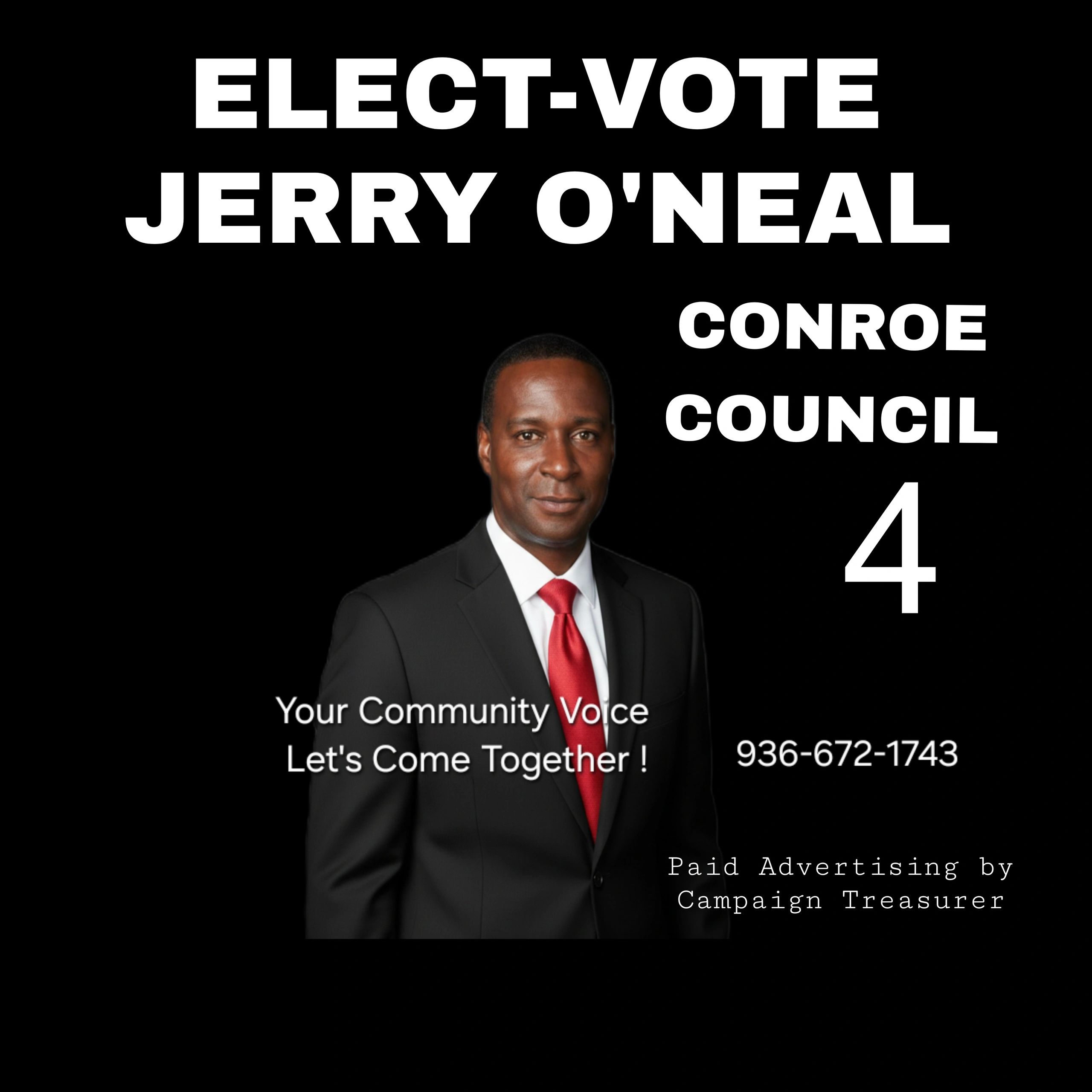 Vote- Elect ..Jerry O'neal for Conroe Council Place 4. Jerry O'Neal has long been a vocal advocate for the residents of Conroe. Addressing issues with City Council Meeting to address the issues that matter the most. His has always been on fairness and transparency and the best interests of the community. Unlike those backed by outside influence, Jerry remains unaffiliated with any special interest groups or entities, ensuring that the people and community are his top priority.